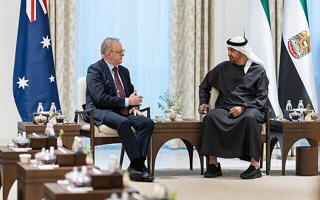 പലസ്തീൻ രാഷ്ട്രത്തിനുള്ള ഓസ്ട്രേലിയയുടെ അംഗീകാരം ഈ മേഖലയിലെ സമാധാനം വർദ്ധിപ്പിക്കുമെന്ന് യുഎഇ പ്രസിഡന്റ് ഷെയ്ക്ക് മുഹമ്മദ് ബിൻ സായിദ് അൽ നഹ്യാൻ. അബുദാബിയിലെ അൽ ഷാദി കൊട്ടാരത്തിൽ വെച്ച് ഓസ്ട്രേലിയൻ പ്രധാനമന്ത്രി ആന്റണി അൽ ബനിസുമായി നടന്ന ഉഭയകക്ഷി ചർച്ചകളുടെ ഭാഗമായാണ് മുഹമ്മദ് ബിൻ സായിദ് ഇക്കാര്യം സൂചിപ്പിച്ചത്. പലസ്തീൻ രാഷ്ട്രത്തെ ഓസ്ട്രേലിയ അംഗീകരിച്ചതിൽ ഓസ്ട്രേലിയൻ പ്രധാനമന്ത്രിയോട് യുഎഇ പ്രസിഡന്റ് നന്ദി അറിയിച്ചു.