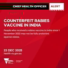 ഇന്ത്യയിൽ വ്യാജ റാബിസ് വാക്സിൻ ബാച്ചുകളുടെ വില്പനയെ കുറിച്ച് സഞ്ചാരികൾക്ക് മുന്നറിയിപ്പ് നൽകി ഓസ്ട്രേലിയ. 2023 നവംബർ 1 മുതൽ റാബിസ് വാക്സിൻ അഭയ്റാബിന്റെ വ്യാജ മരുന്നുകൾ പ്രചാരത്തിലുണ്ടെന്ന് ഓസ്ട്രേലിയൻ ടെക്നിക്കൽ അഡ്വൈസറി ഗ്രൂപ്പ് ഓൺ ഇമ്മ്യൂണൈസേഷനെ ( ATAGI) അറിയിച്ചു. അഭയ്റാബിന് ഓസ്ട്രേലിയയിൽ അംഗീകാരമോ വിതരണമോ ഇല്ലെന്നും ഇന്ത്യ സന്ദർശിക്കുമ്പോൾ ഈ വാക്സിൻ സ്വീകരിച്ച വ്യക്തികൾക്ക് റാബിസിനെതിരെ മതിയായ സംരക്ഷണം ലഭിച്ചേക്കില്ലെന്ന് മുന്നറിയിപ്പിൽ പറയുന്നു. കൂടാതെ സഞ്ചാരികൾ തിരിച്ചെത്തുമ്പോൾ കൂടുതൽ വൈദ്യസഹായം വേണ്ടിവന്നേക്കാമെന്നും മുന്നയിപ്പിൽ പറയുന്നു. 2023 നവംബർ ഒന്നിനോ അതിന് ശേഷമോ ഇന്ത്യയിൽ നിന്നും റാബിസ് വാക്സിൻ എടുത്തിട്ടുള്ള ഓസ്ട്രേലിയക്കാർ എത്രയും വേഗം ഒരു ജനറൽ പ്രാക്ടീഷണറെയോ ട്രാവൽ ഹെൽത്ത് സ്പെഷ്യലിസ്റ്റിനെയോ സമീപിക്കാനും ആരോഗ്യവകുപ്പ് കഴഞ്ഞ 19 -ാം തിയതി ഇറക്കിയ പത്രക്കുറിപ്പിൽ നിർദ്ദേശിക്കുന്നു.