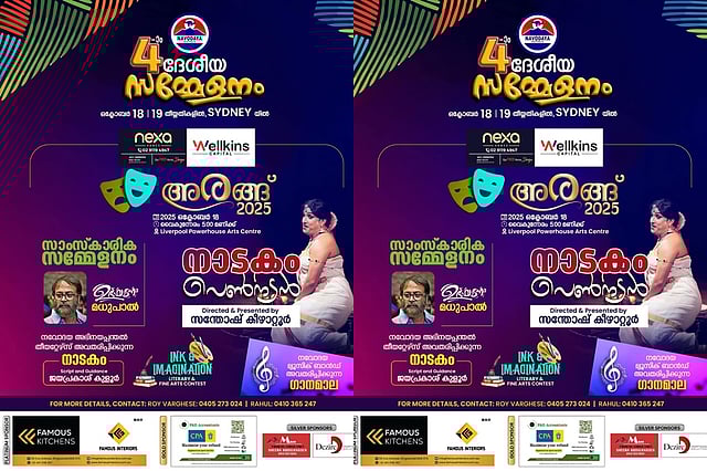 ഒക്ടോബർ 18 വ്യാഴാഴ്ച വൈകിട്ട് 5.00 മണിക്ക് സിഡ്നി ലിവർപൂർ പവർഹൗസ് ആർട്ട് സെന്ററിൽ അരങ്ങ് 2025 ആരംഭിക്കും. കൂടുതൽ വിവരങ്ങൾക്ക് റോയ് വർഗീസ്- 0405 273014, 0410 364247