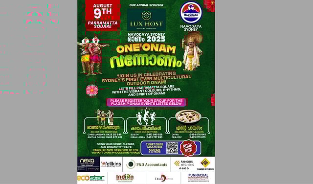 നവോദയ സിഡ്നിയുടെ ഓണാഘോഷം 2025 "ONE'ONAM" ആഗസ്റ്റ് 9 ന് Parramatta Square ൽ വെച്ച് നടക്കും. Annual sponsor ആയ LUX HOST ൻ്റെ ആഭിമുഖ്യത്തിലുള്ള ഓണാഘോഷ പരിപാടിയുടെ ടിക്കറ്റ് ബുക്കിങ്ങ് ആരംഭിച്ചു. മുതിർന്നവർക്ക് $35 ഉം കുട്ടികൾക്ക് (5-12 Years) $25 ആണ് ടിക്കറ്റ് നിരക്ക്. ഓണാഘോഷയാത്ര മുതൽ കൾച്ചറൽ പ്രോഗ്രാമുകളും മത്സരങ്ങളും അടങ്ങുന്ന പരിപാടികളിൽ പങ്കെടുക്കാൻ ആഗ്രഹിക്കുന്നവരും ഗ്രൂപ്പുകളും ഇന്ന് തന്നെ രജിസ്റ്റർ ചെയ്യുക.